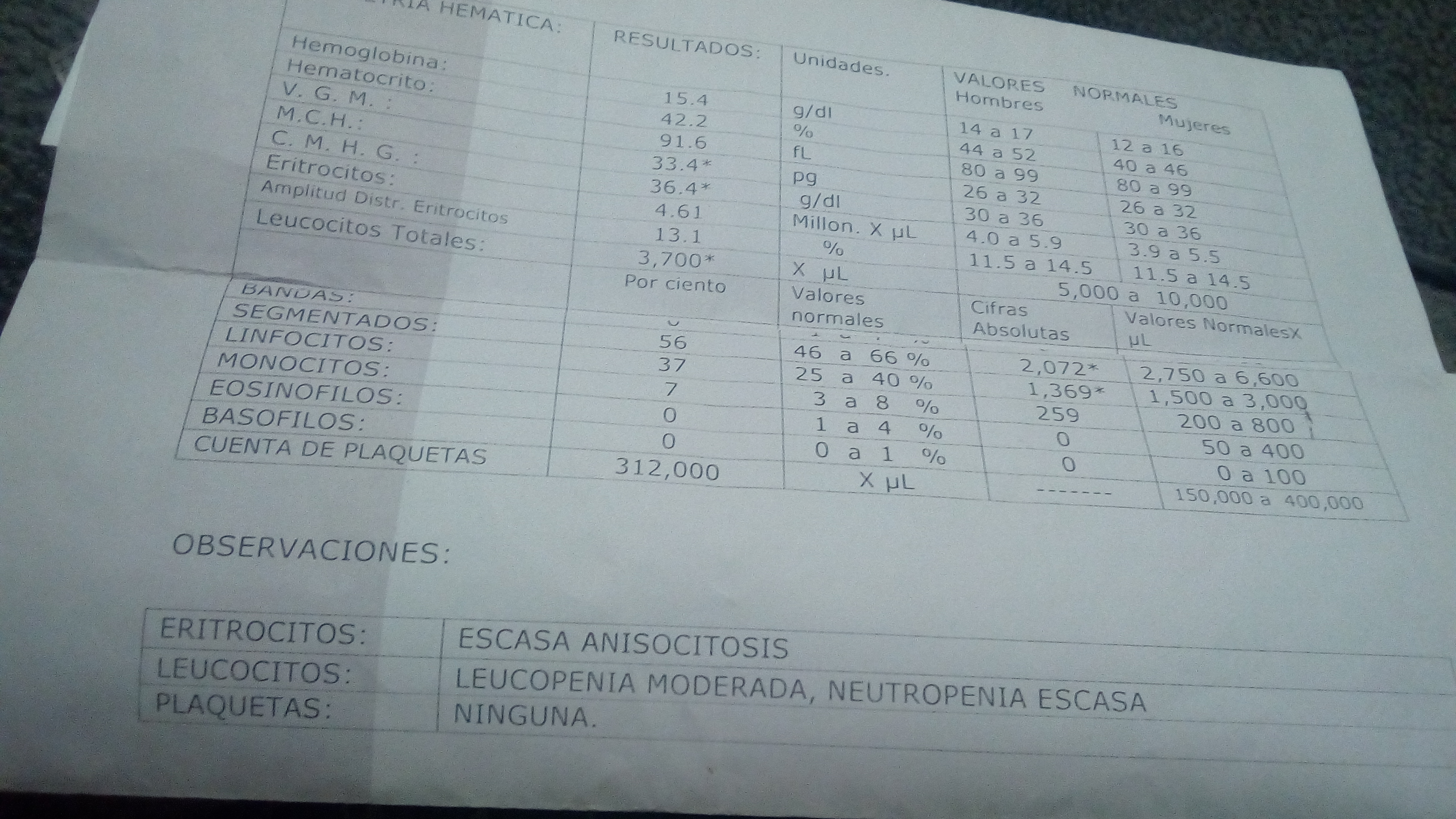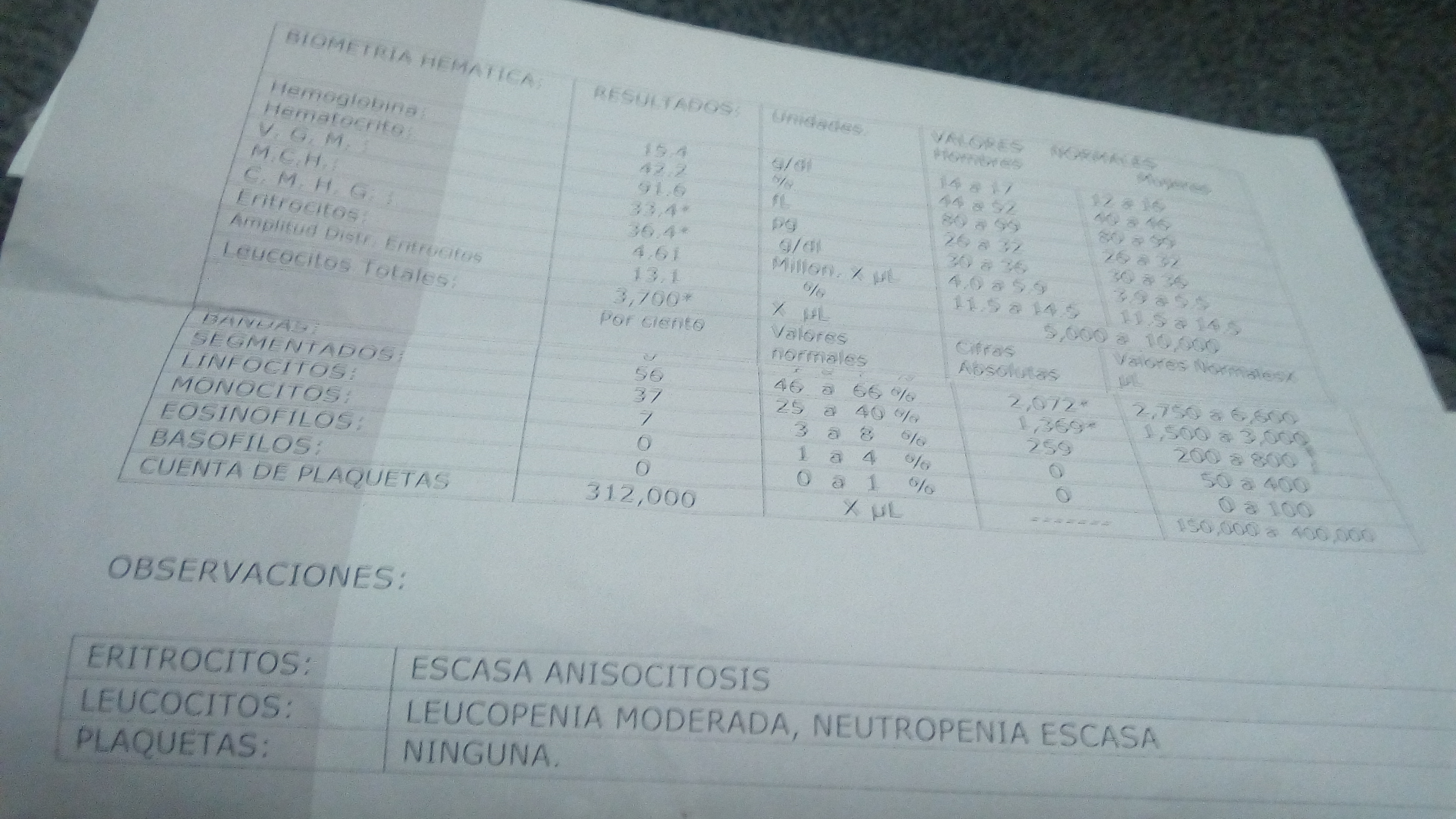El junio me realice una biométria temática la cual tenia los valores normales pero hace unos días realice otra y salio q tengo leucopenia moderada y neutropenia