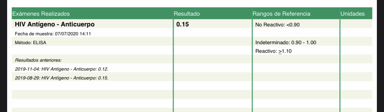tuve dos relaciones de riesgo, la primera el día 11 de junio con una masajista pero todo fue con protección y la segunda el 16 de junio igual pero no hubo penetracion solo roce con sus partes íntimas y masajes, me hice dos pruebas el día 30 de junio (19 y 14 días después según exposición) me realice una prueba rápida de 3 generación saliendo no reactivo y otra aparte solo antígeno p24 saliendo no reactivo (dejó imágenes) el día 7 de julio ( 26 y 21 días después según exposición) me hice la prueba Elisa de 4ta generación saliendo 0.15 no reactivó (dejó imágenes) aun sigo preocupado, debería estar más tranqui, ya que leí algo de que el Elisa solo detecta de 15 a 20 días y luego ya no o algo así, les agradecería me ayuden