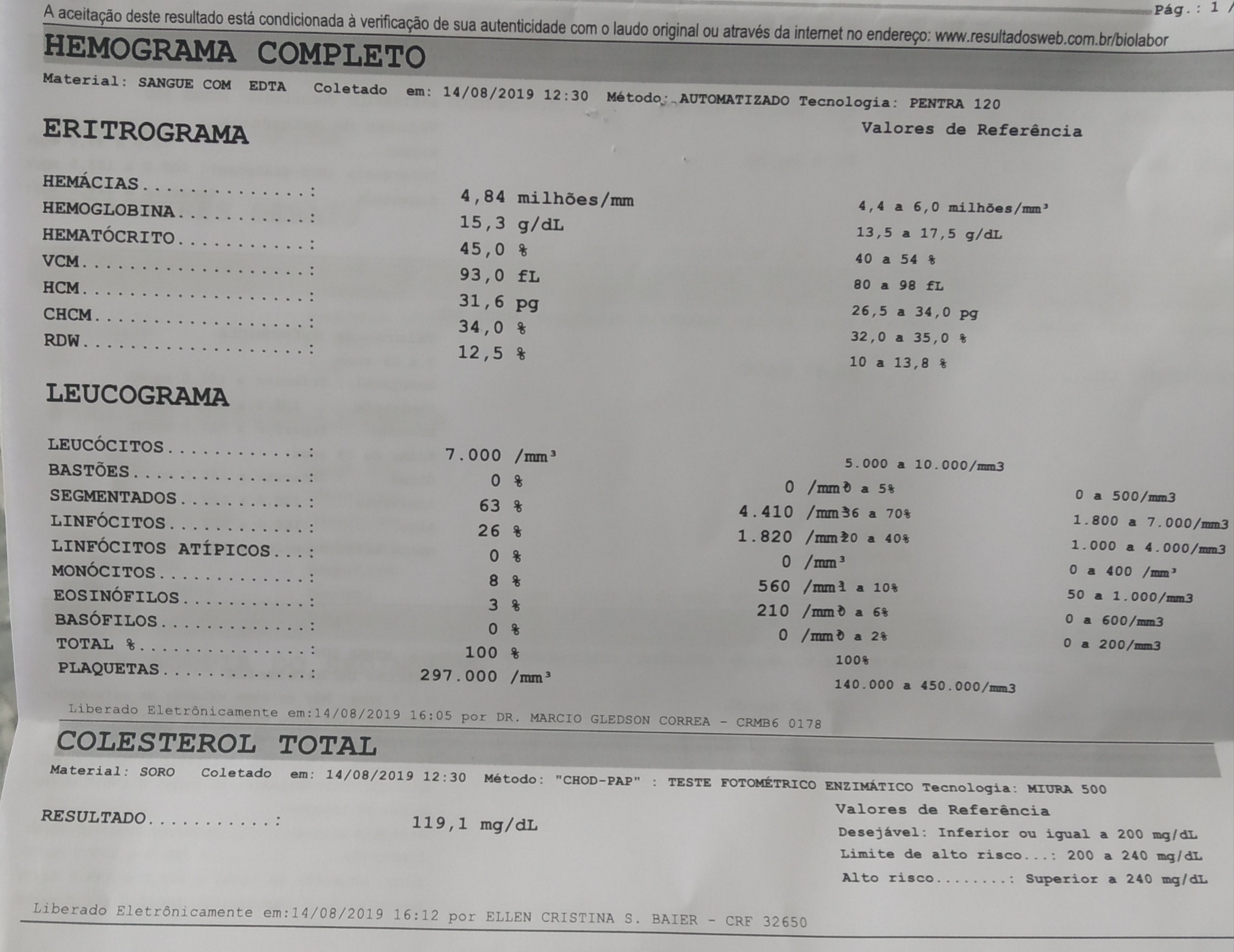 Mi nombre es Alejandro, vivo en Brasil... Le pido que me ayude a revisar mi hemograma ya que tengo muchas dudas. Hace más de un año tuve relaciones con un chico sin preservativo durante un tiempo, lo que me ha tenido muy preocupado desde entonces, hace como 2 meses comencé a tener manchitas rojas en la piel que aparecen y desaparecen, además de eso tengo los ganglios linfáticos del cuello inflamados hace más de un mes, siento una fatiga horrible, aftas en la boca... Me hice test rápido de VIH y salió negativo, pero sigo dudando. Si me puede ayudar a interpretar ese hemograma y si puede decir algo al respecto, le agradecería mucho, la incertidumbre me está matando, tengo miedo de tener sida y leí en internet que los síntomas que tengo son comunes en el sida. No he ido al médico debido a que no tengo dinero y el sistema de salud público aquí es muy lento.