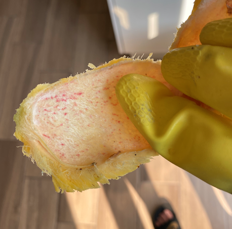 A penas hace unas horas compre unos mangos en el supermercado los pele yo misma y resulta que yo tengo la costumbre de quedarme chupando las semillas con sal y pimienta ahora bien uno de los mando presentaba las siguentes manchas me desperto muchas dudas asi que con el cuchillo abri la semilla y para mi sorpresa estaba mas rojo por dentro cabe mencionar que yo presento heridas abiertas en mi boca por tartamientos dentales.