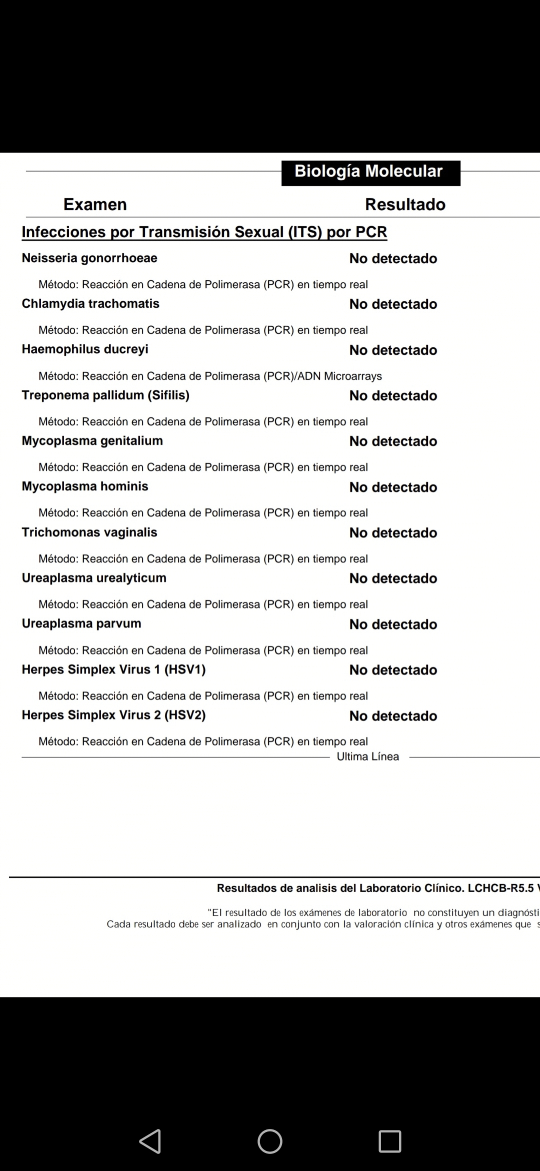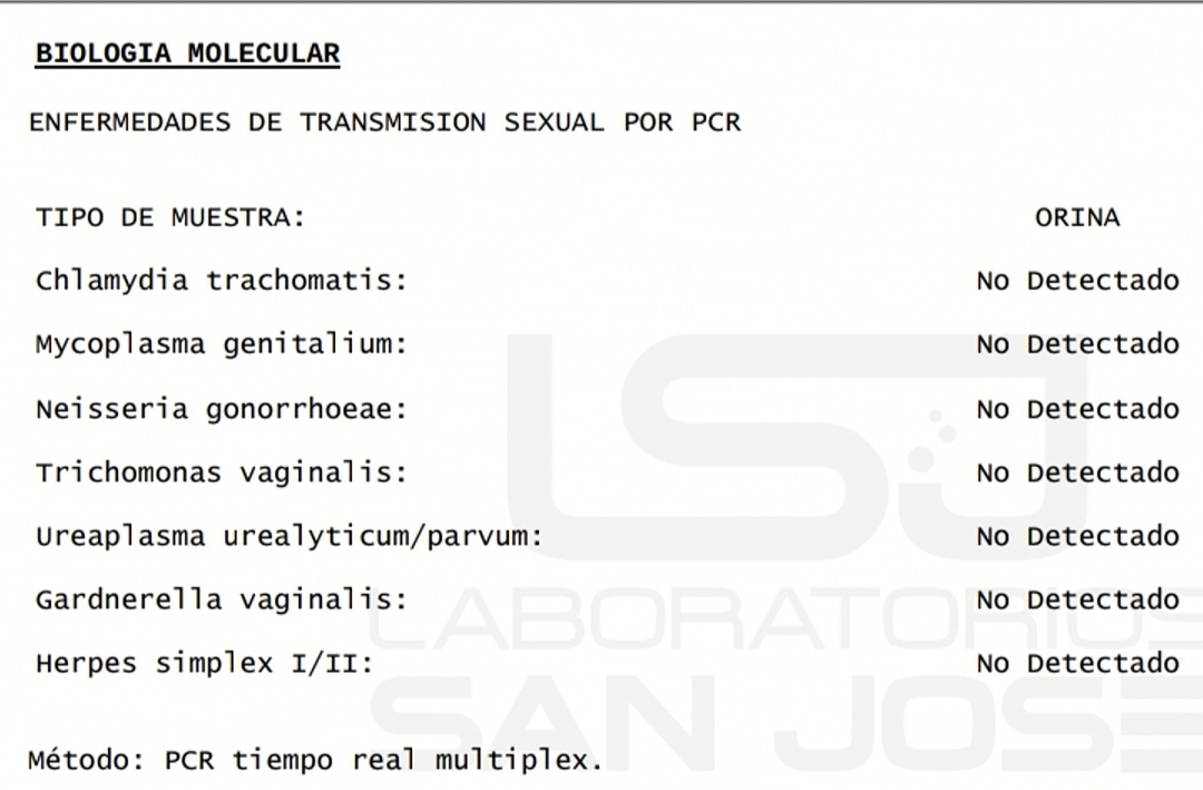 2 pruebas panel de ITS varias. A los 9 y 33 días de la relación. Todos negativos
