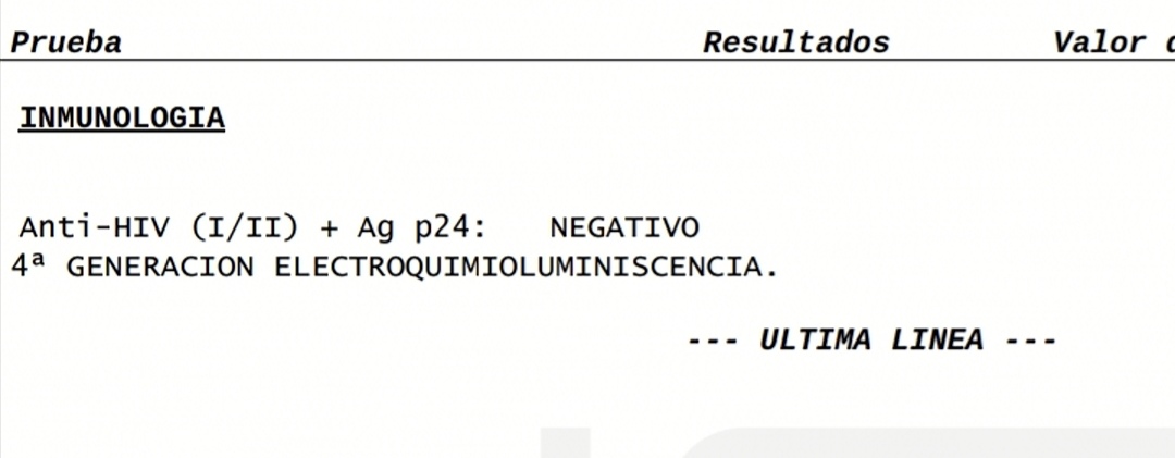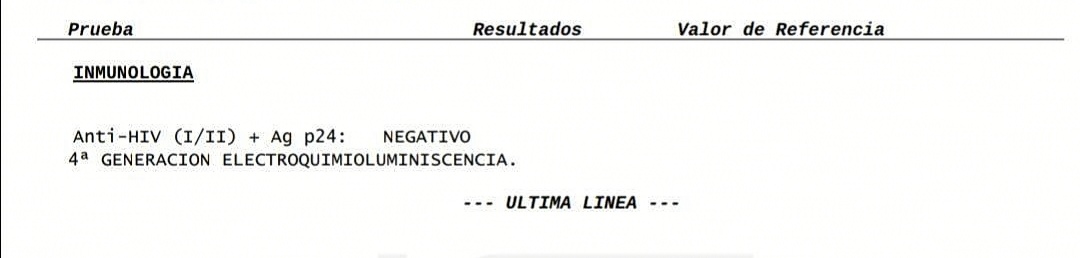 Yo me he realizado 3 pruebas 4ta generación ECLIA vih 1y2 y p24. A los 17,24y31 días de la relación. Todas con resultado negativo.