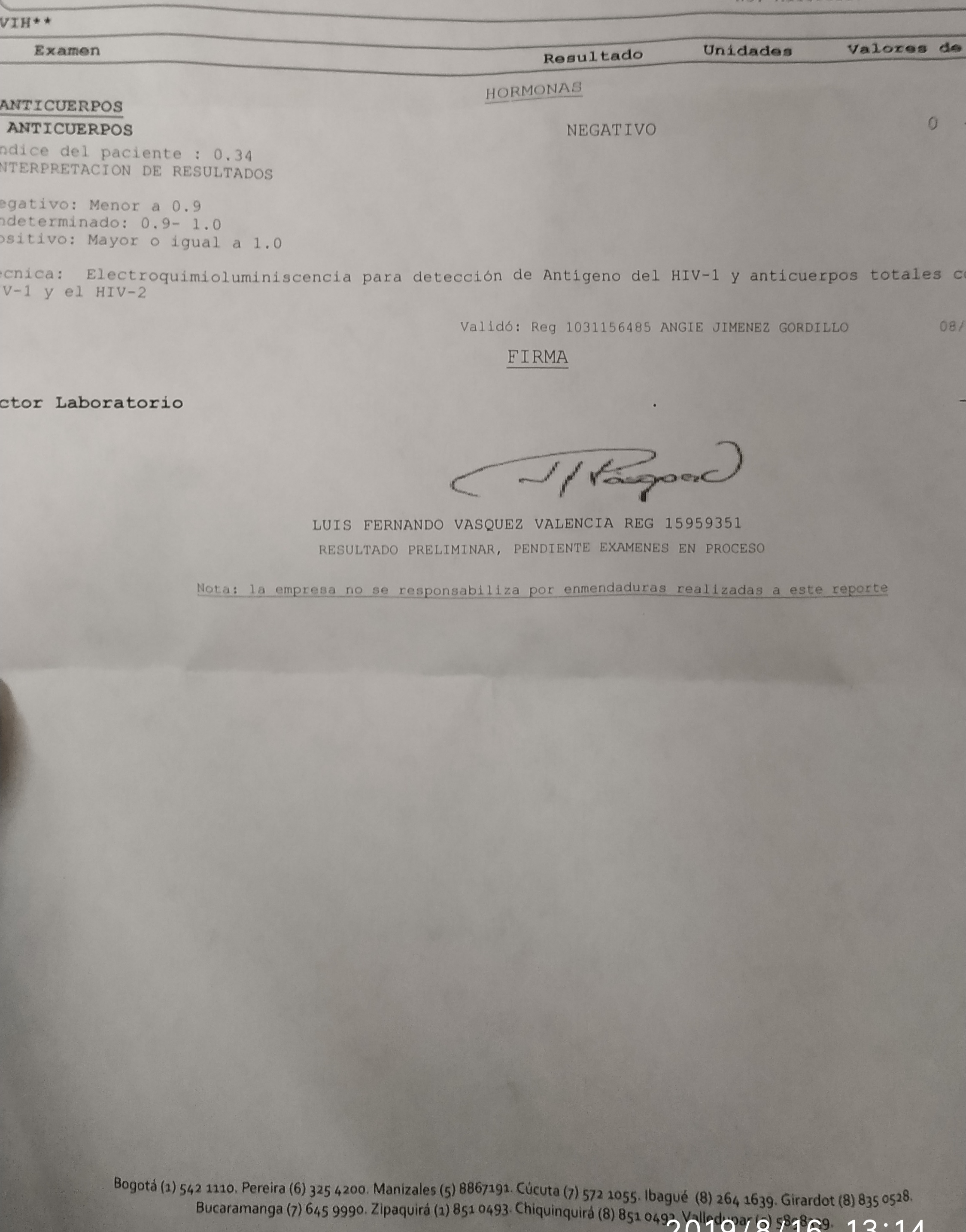 Te cuento que me han salido llagas y aftas en la boca dolor de cabeza me duele el cuerpo y los ganglios quiero saber si puedo confiar en lo negativo de la prueba mes de riesgo 9 de abril 2019 prueba realizada 9 de agosto de 2019.