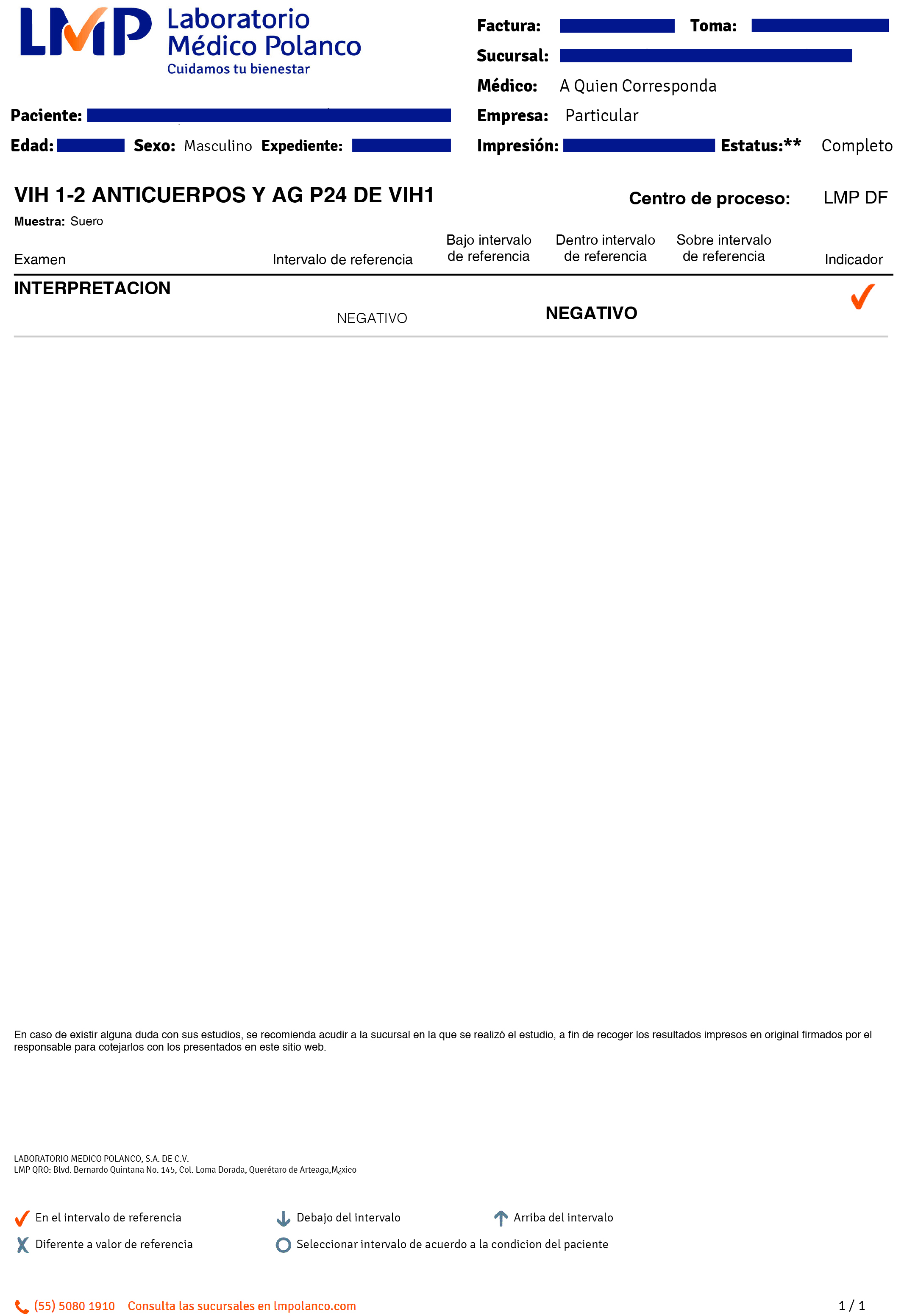 El día de ayer me realicé una prueba de vih de 4ta generación, a los 2 meses de una relación de riesgo, en un Laboratorio "Médica Polanco", en la ciudad de México. Ya me entregaron los resultados pero no entiendo a que se refiere al último apartado donde dice "indicadores" y sale con una paloma. En la parte de abajo dice que es "En el intervalo de referencia" pero no lo entiendo. Podrían despejar mis dudas.